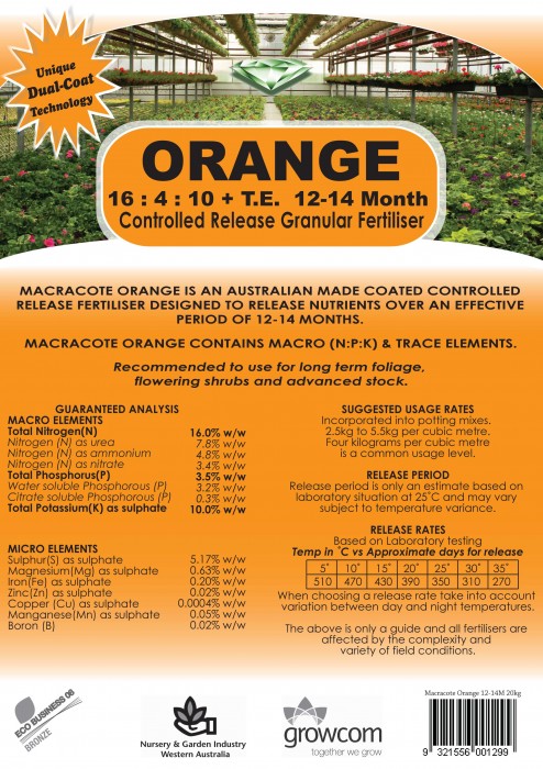 Macracote Plus CRF Orange 16:4:10 + TE, 12-14 month - SMOULT Mobile Horticultural Suppliers