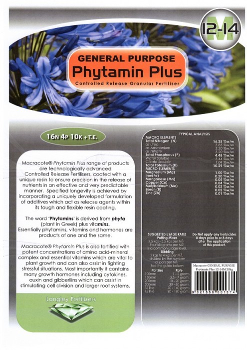 Macracote® Phytamin Plus is also fortified with potent concentrations of amino acid) mineral complex and essential vitamins which are vital to plant growth and can also assist in fighting stressful situations. Most importantly it contains many growth hormones including cytokines, auxin and gibberellins which can assist in stimulating cell division and larger root systems.